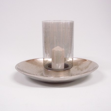 Sehr schönes massives Windlicht in Form einer ovalen Schale aus hochwertigem Aluminiumguss mit Antikfinish in silber. Die Schale läßt sich ganzjährig edel dekorieren. Das Glas mit Lufteinschlüsse ist grau durchgefärbt.