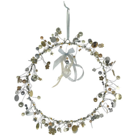 Fester Drahrkranz mit grauen, silbernen, goldenen Perlen sowie einem Glaskristall und einem Satinband zum Aufhängen.