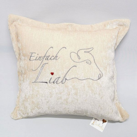 Feines Chenillesamt Zierkissen bestickt mit stilisiertem Schriftzug der in einen Kuhkopf übergeht. Nicht nur ein liebevoller Hingucker für Kuhfreunde, auch der feine Stoff mit leichtem Glanz bietet eine weiche anschmiegsame Haptik. Die Wertigkeit wird mit dem Stehsaum unterstrichen.